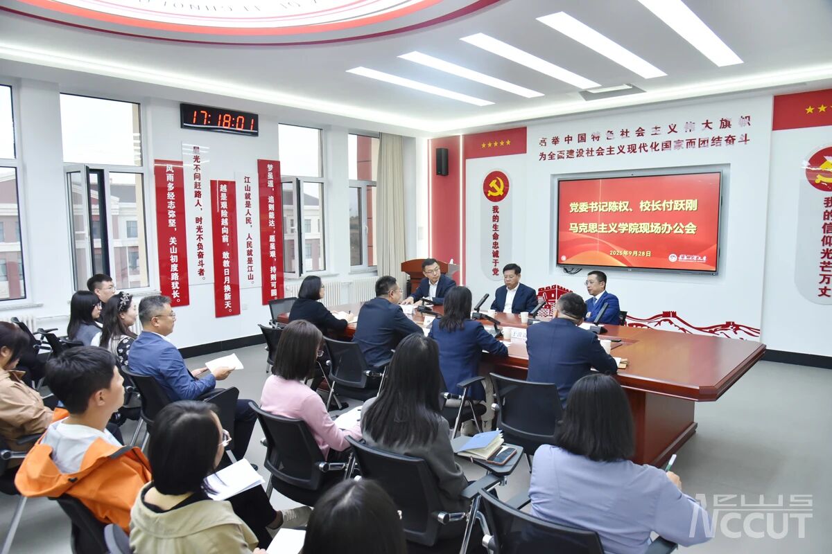 学校党委始终高度重视马克思主义学院的建设与发展。此次陈权书记、付跃刚校长的专题调研与现场办公,充分体现了学校党委对马克思主义学院发展的高度关注与大力支持,为学院在新起点上实现更高质量、更高水平的发展明晰了路径、注入了强大信心。马克思主义学院全体教职工表示,将在学校党委的坚强领导下,以此次调研指导为新的契机,进一步凝聚共识、锐意进取、扎实工作,以更加昂扬的奋斗姿态和更加务实的工作作风,全力推动学院各项事业实现新跨越、再上新台阶,为培养堪当民族复兴大任的时代新人,为学校特色高水平应用研究型大学建设和教育强国事业作出新的更大贡献!