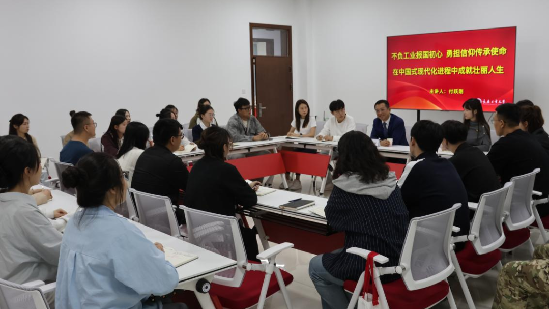 调研活动期间,付跃刚还以《不负工业报国初心 勇担信仰传承使命——在中国式现代化进程中成就壮丽人生》为主题,为马克思主义学院硕士研究生讲授了一堂立意高远、内涵丰富、深刻生动的思想政治理论课。付跃刚对同学们提出三点期望:一要勤于思考,勇于实践,在知行合一中练就过硬本领;二要敏锐洞察,拥抱变革,善于运用先进工具,在智能化浪潮中抢占发展先机;三要深植理论,学透悟透,在信仰的传承与践行中勇担时代主力军。课堂气氛热烈,掌声不断,同学们深感振奋,纷纷表示将铭记校长嘱托,砥砺前行,将“工业报国”的初心与“信仰传承”的使命深深融入学习与研究之中,努力为实现中国式现代化贡献青春力量。