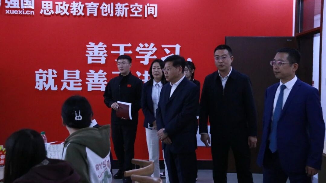 陈权、付跃刚一行实地考察了马克思主义学院的教学设施与创新平台,先后走访了智慧教室、多功能教室、报告厅等教学场所,重点调研了“学习强国”思政教育创新空间、红途印记互动馆、薪火之路体验馆、学习强国星火书堂等思政教育新载体。学校领导深入各教研室、研究机构、办公室,与学院师生进行亲切交流,细致询问大家在学习、工作及生活等方面的具体情况,勉励师生们立足岗位、勤勉钻研,为马克思主义理论教学研究贡献智慧与力量。